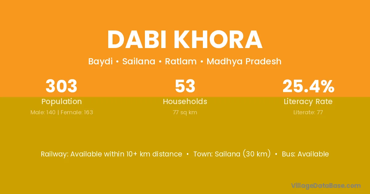 Sailana (30 km) is the nearest town to Dabi Khora village for major economic activities and is located approximately 30 km away.