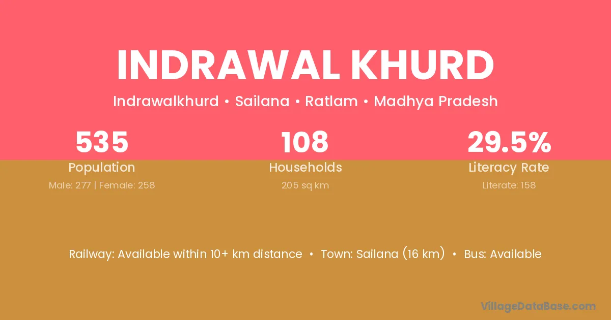 Sailana (16 km) is the nearest town to Indrawal Khurd village for major economic activities and is located approximately 16 km away.