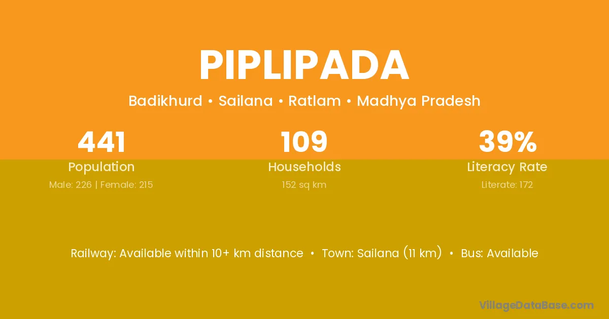 Sailana (11 km) is the nearest town to Piplipada village for major economic activities and is located approximately 11 km away.