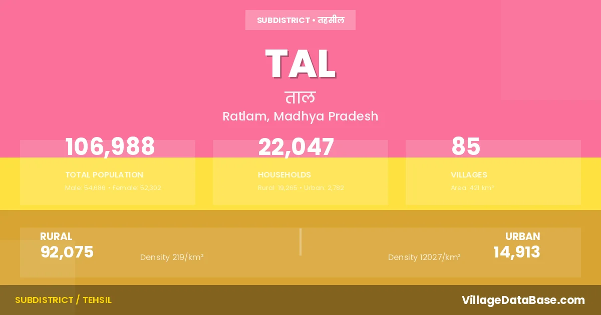 Tal is a town and Tehsil in the Ratlam district of the Madhya Pradesh. In India, a Tehsil is a subdivision of a district responsible for the administration and revenue collection of a specific area within the district. Tehsils play a crucial role in the local governance structure, contributing significantly to the development and administration of their communities.