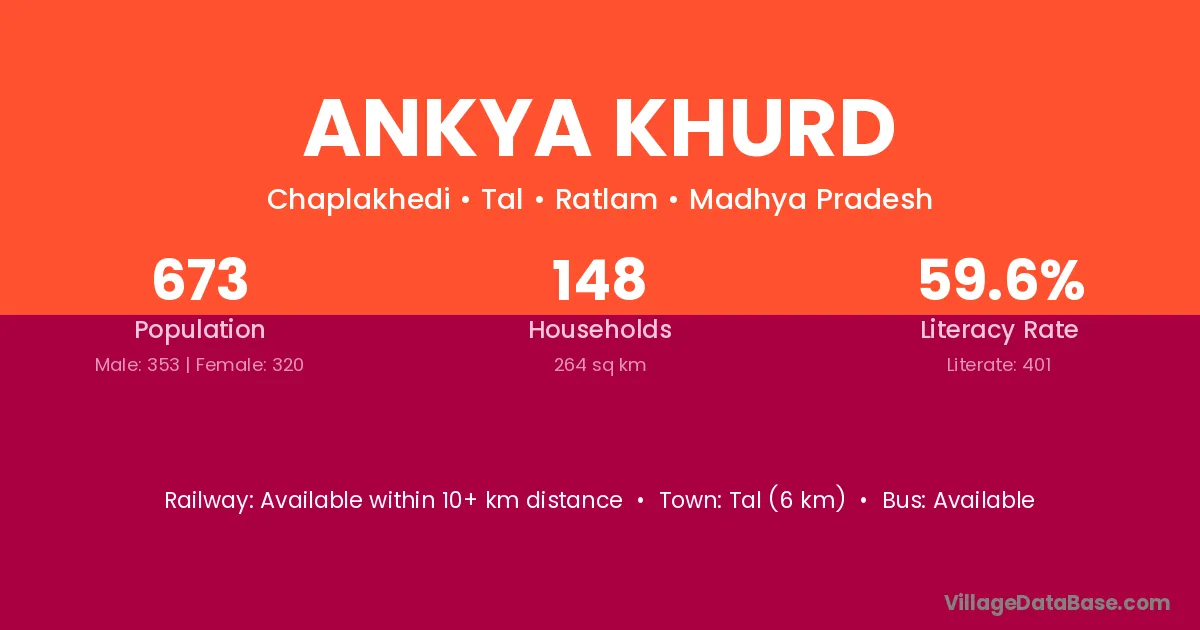 Ankya Khurd village has a total population of 673 people, of which 353 are males and 320 are females.