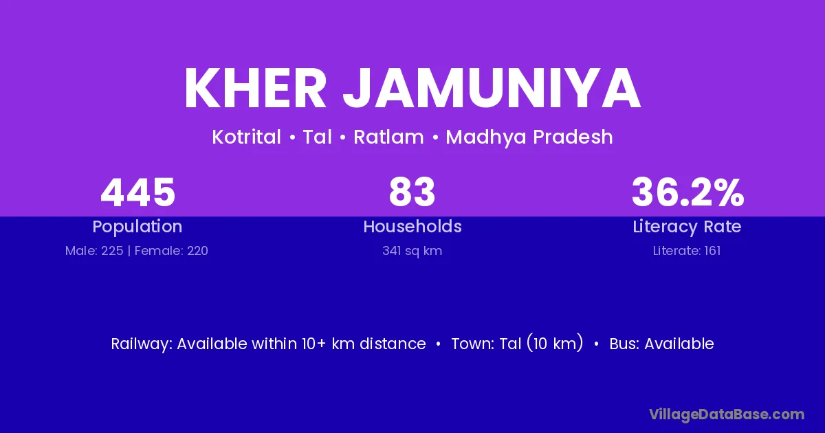 Kher Jamuniya village has a total population of 445 people, of which 225 are males and 220 are females.