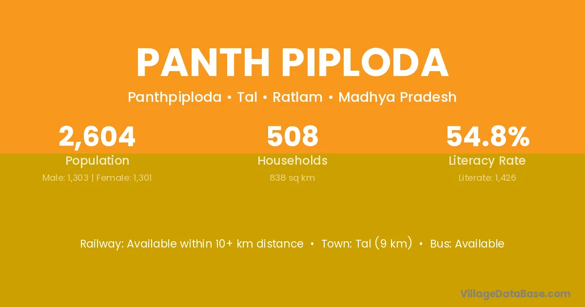 Panth Piploda village has a total population of 2,604 people, of which 1,303 are males and 1,301 are females.