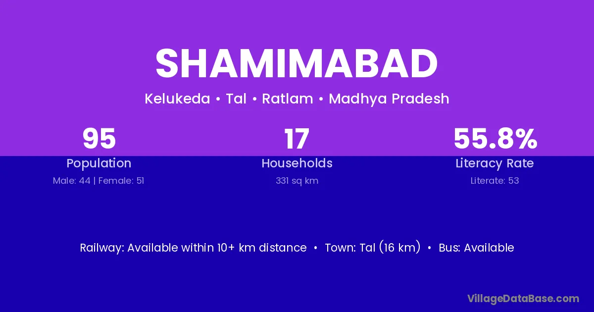 Shamimabad village has a total population of 95 people, of which 44 are males and 51 are females.