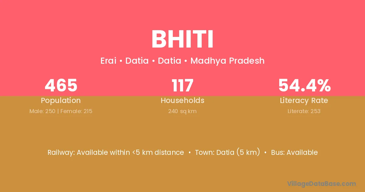 The literacy rate of Bhiti village is 65.64%. Male literacy stands at 79.56% and female literacy at 52.77%.