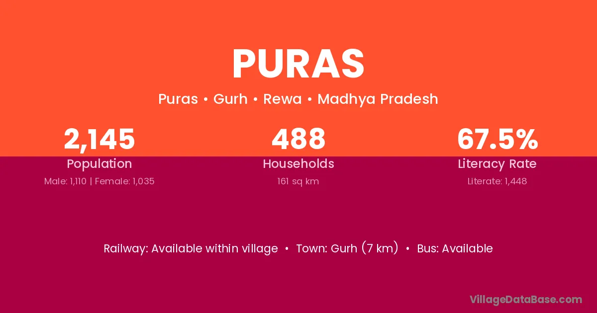 Puras village has a total population of 2,145 people, of which 1,110 are males and 1,035 are females.
