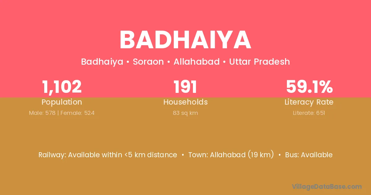 Badhaiya village has a total population of 1,122 people, of which 580 are males and 542 are females.