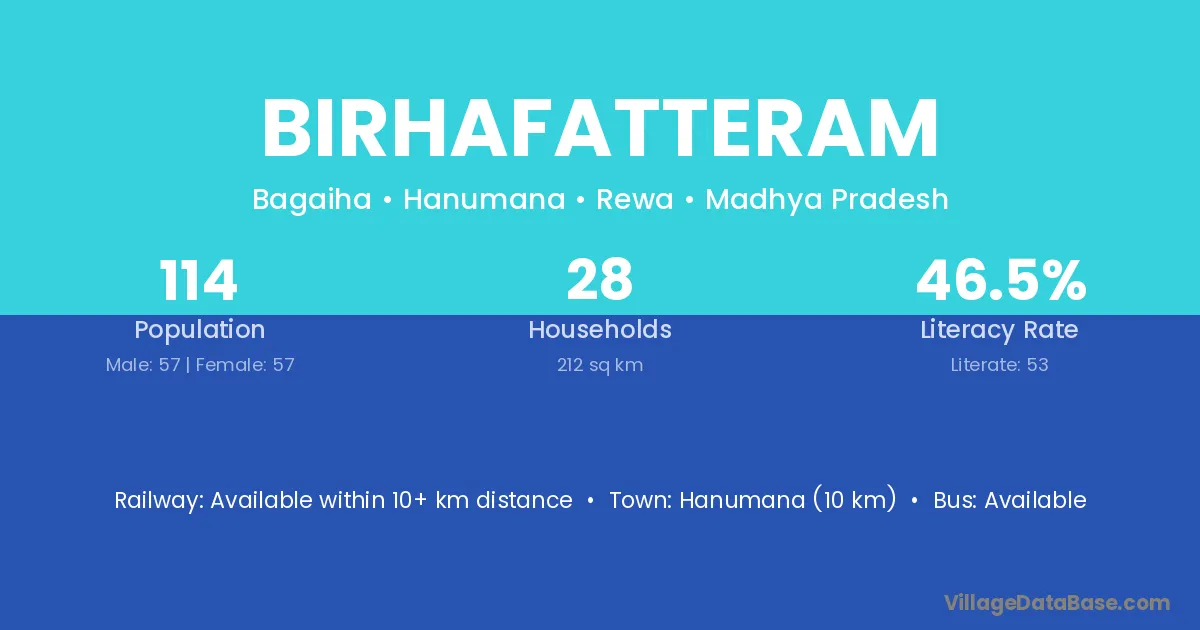 Birhafatteram village has a total population of 114 people, of which 57 are males and 57 are females.