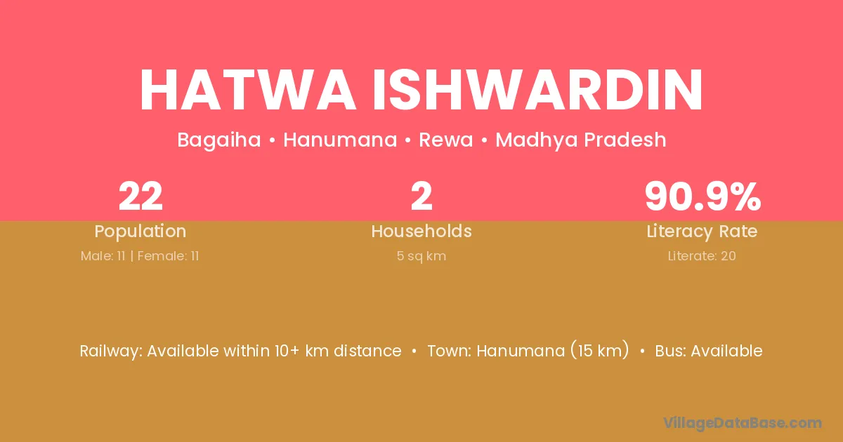 Hatwa Ishwardin village has a total population of 22 people, of which 11 are males and 11 are females.