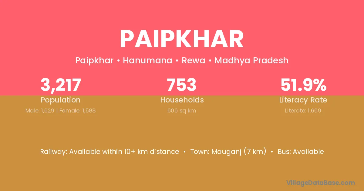 Paipkhar village has a total population of 3,217 people, of which 1,629 are males and 1,588 are females.