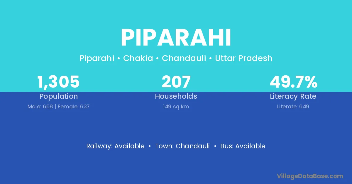 The literacy rate of Piparahi village is 37.74%. Male literacy stands at 47.28% and female literacy at 27.59%.