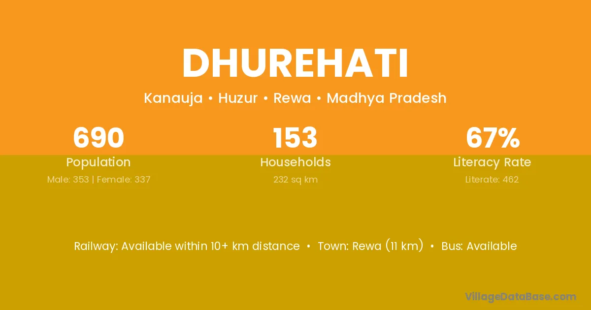 Rewa (11 km) is the nearest town to Dhurehati village for major economic activities and is located approximately 11 km away.