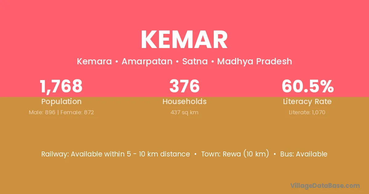 Rewa (6 km) is the nearest town to Kemar village for major economic activities and is located approximately 6 km away.