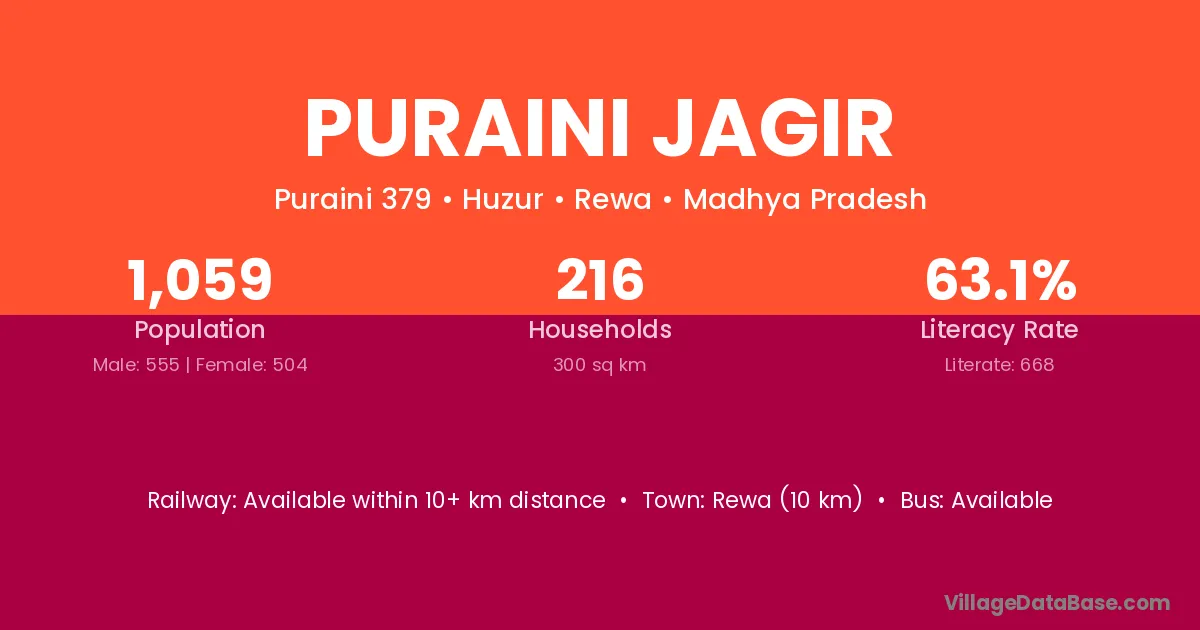 Rewa (10 km) is the nearest town to Puraini Jagir village for major economic activities and is located approximately 10 km away.