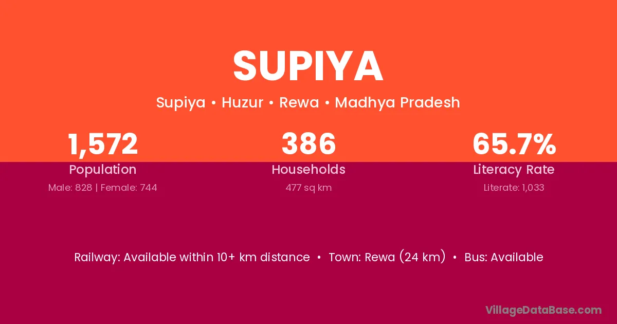 Rewa (24 km) is the nearest town to Supiya village for major economic activities and is located approximately 24 km away.