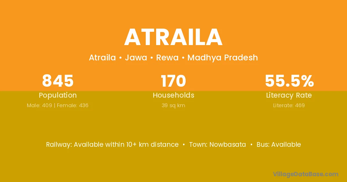 Atraila village has a total population of 845 people, of which 409 are males and 436 are females.