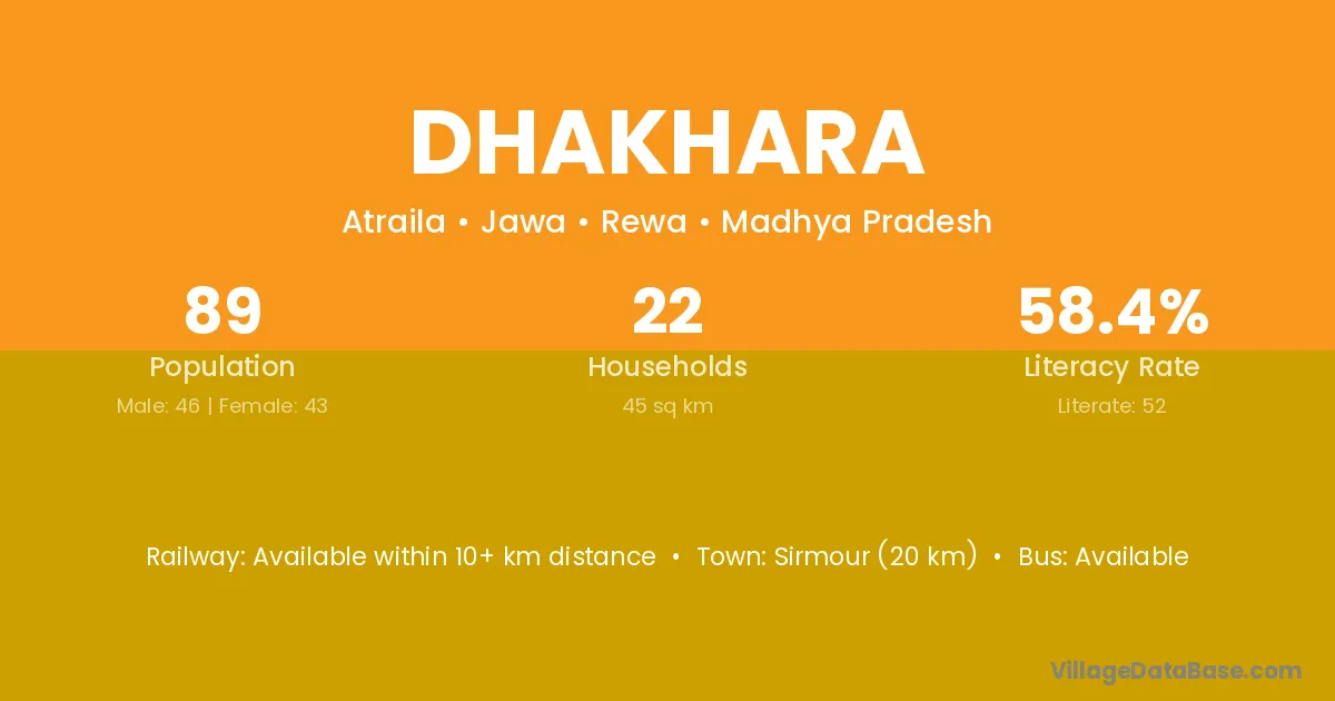Dhakhara village has a total population of 89 people, of which 46 are males and 43 are females.