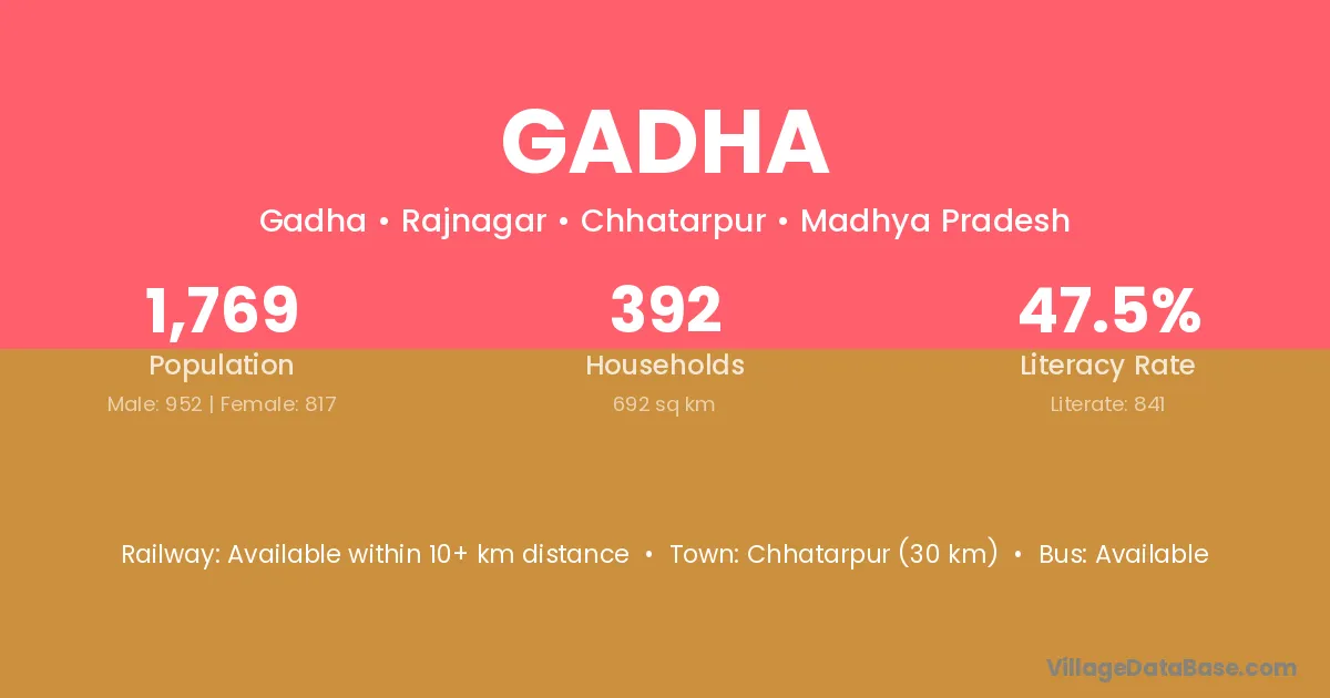 Rewa (75 km) is the nearest town to Gadha village for major economic activities and is located approximately 75 km away.