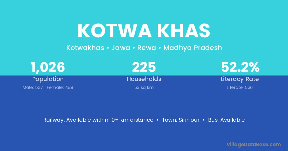 Kotwa Khas village has a total population of 1,026 people, of which 537 are males and 489 are females.
