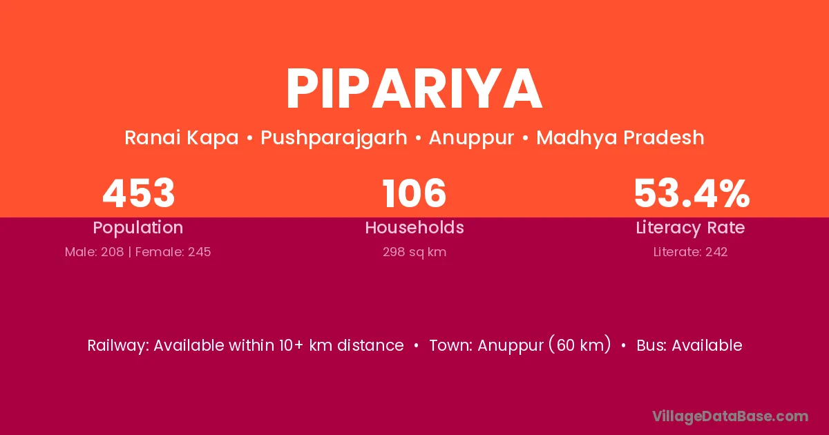 Pipariya village has a total population of 576 people, of which 288 are males and 288 are females.