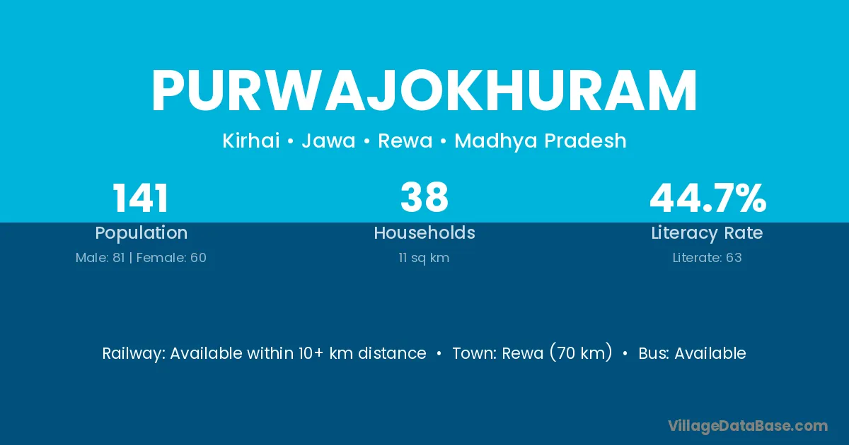 Rewa (70 km) is the nearest town to Purwajokhuram village for major economic activities and is located approximately 70 km away.