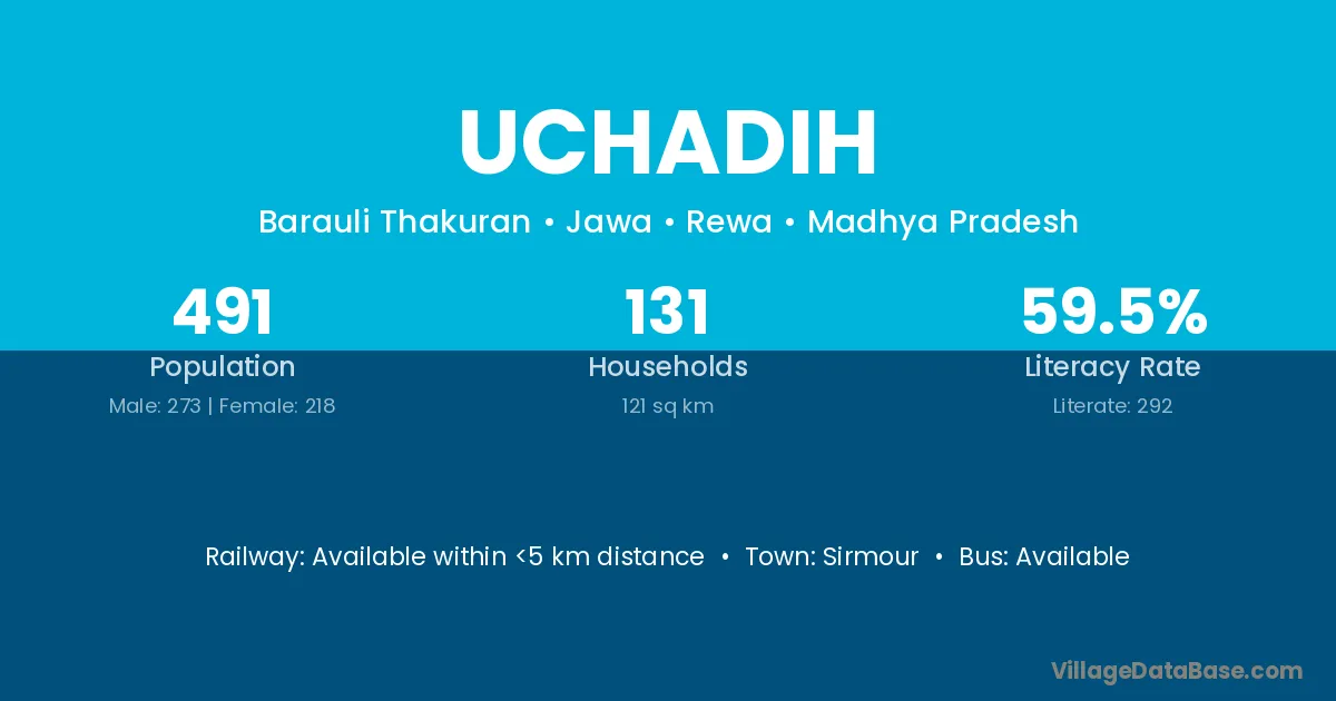 Uchadih village has a total population of 491 people, of which 273 are males and 218 are females.