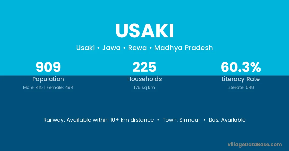 Usaki village has a total population of 909 people, of which 415 are males and 494 are females.