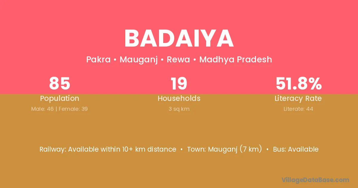 Mauganj (7 km) is the nearest town to Badaiya village for major economic activities and is located approximately 7 km away.