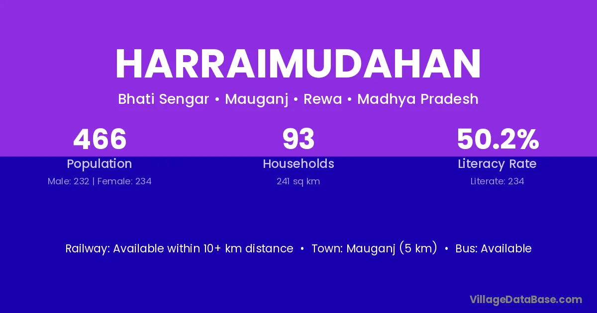 Mauganj (5 km) is the nearest town to Harraimudahan village for major economic activities and is located approximately 5 km away.