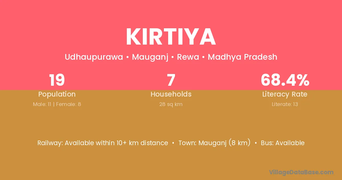Mauganj (8 km) is the nearest town to Kirtiya village for major economic activities and is located approximately 8 km away.