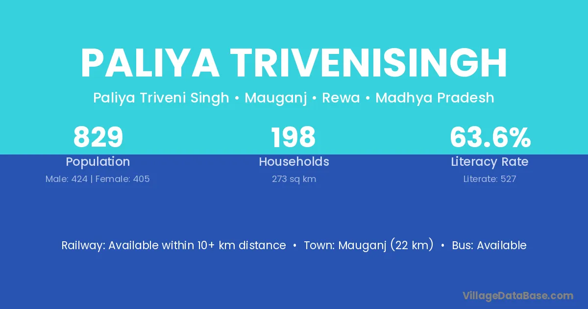 Paliya Trivenisingh village has a total population of 829 people, of which 424 are males and 405 are females.