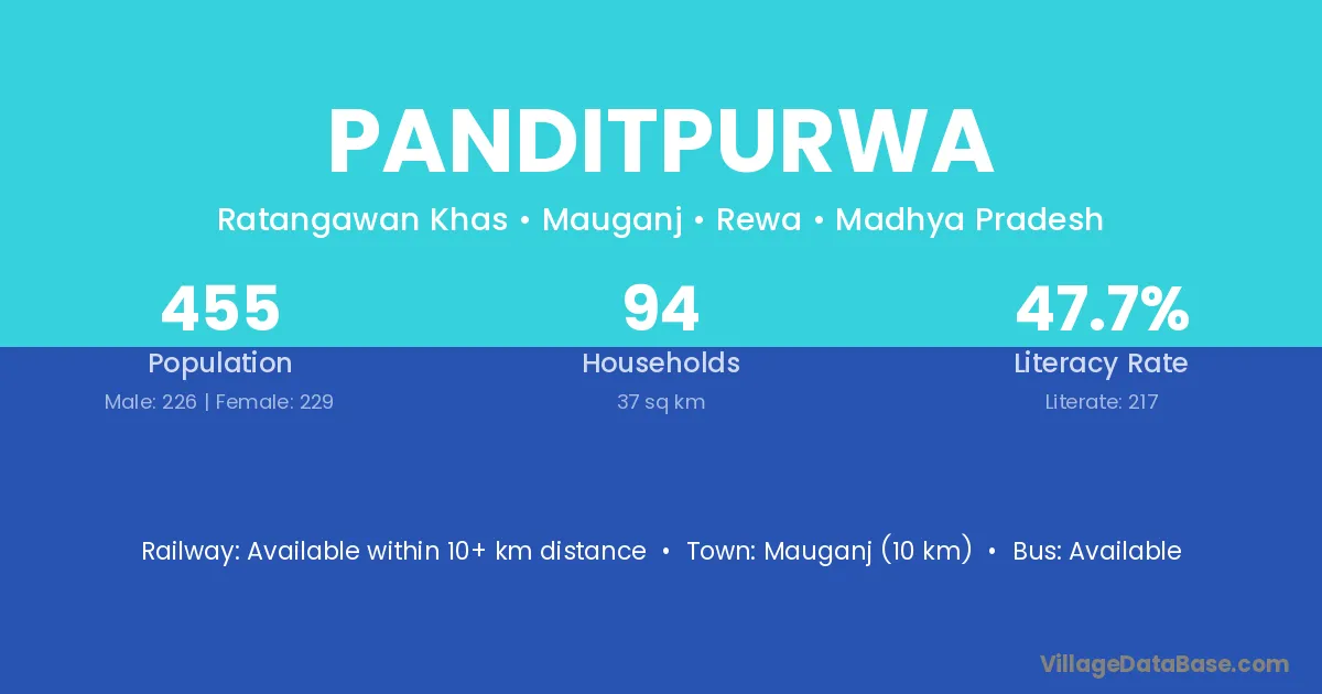 Panditpurwa village has a total population of 455 people, of which 226 are males and 229 are females.