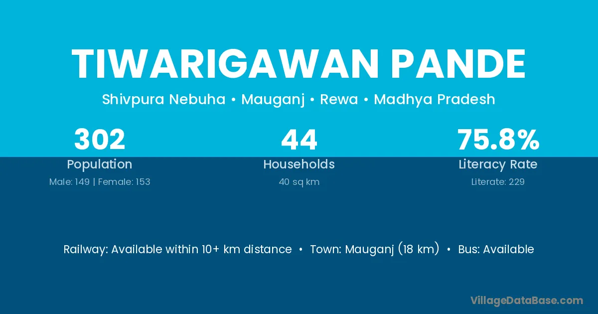 Mauganj (18 km) is the nearest town to Tiwarigawan Pande village for major economic activities and is located approximately 18 km away.