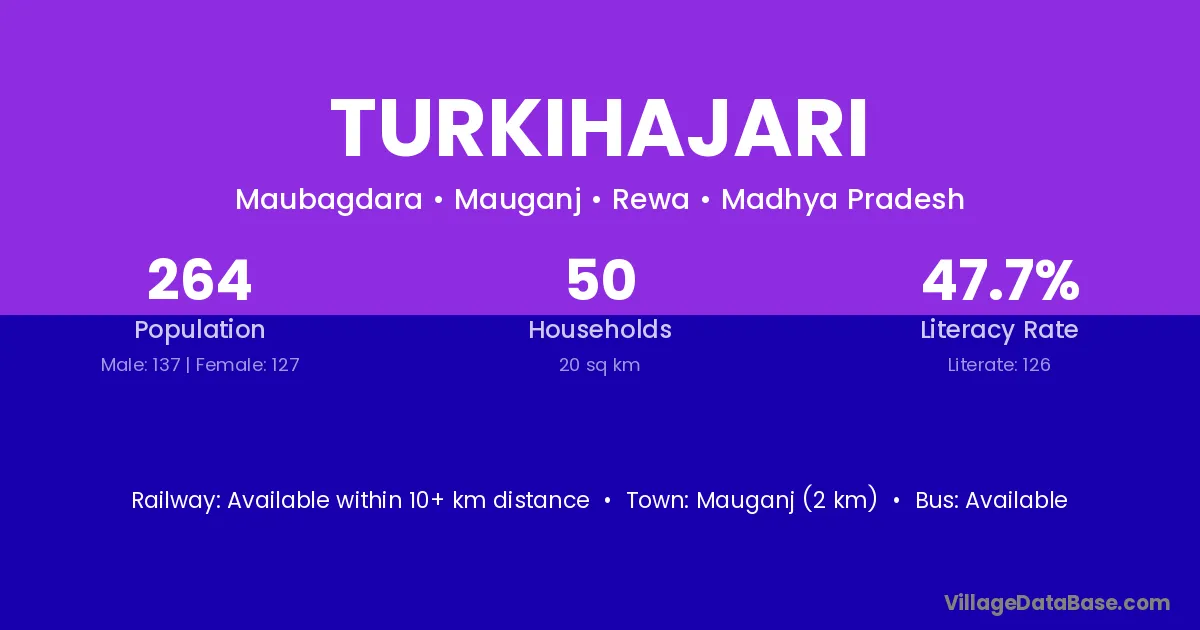 Mauganj (2 km) is the nearest town to Turkihajari village for major economic activities and is located approximately 2 km away.