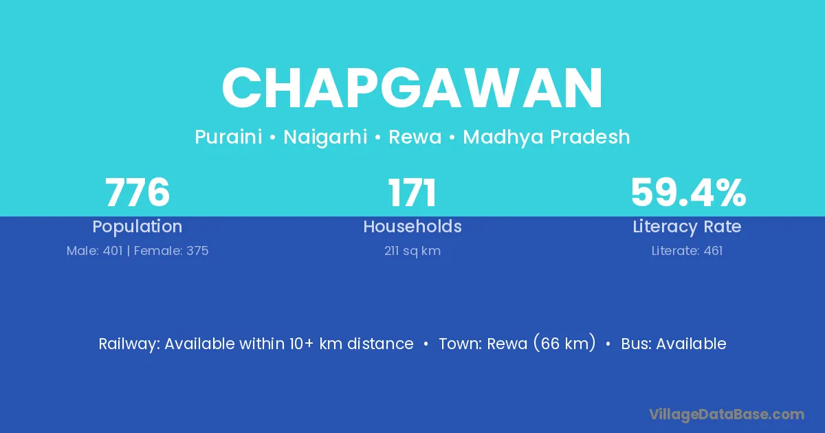 Rewa (66 km) is the nearest town to Chapgawan village for major economic activities and is located approximately 66 km away.