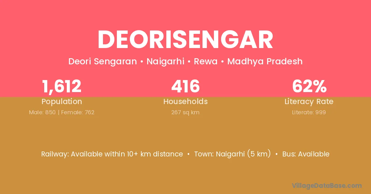 Deorisengar village has a total population of 1,612 people, of which 850 are males and 762 are females.