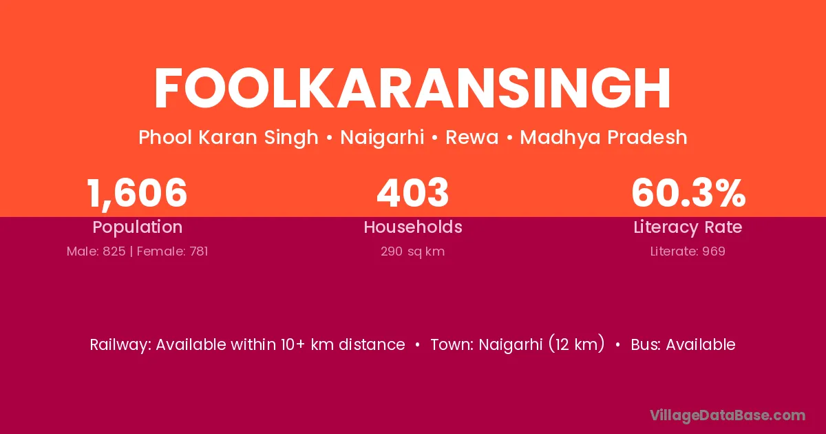 Foolkaransingh village has a total population of 1,606 people, of which 825 are males and 781 are females.