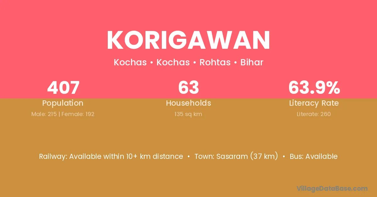 The literacy rate of Korigawan village is 58.64%. Male literacy stands at 68.01% and female literacy at 48.27%.