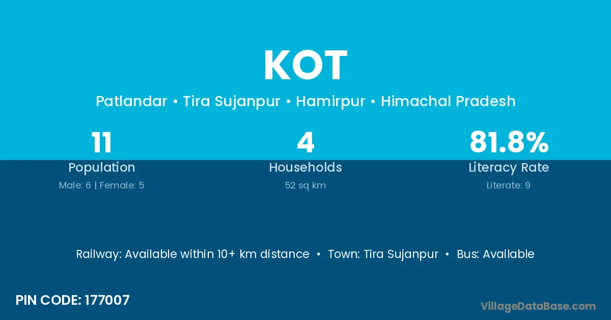 The literacy rate of Kot village is 61.20%. Male literacy stands at 69.76% and female literacy at 51.71%.