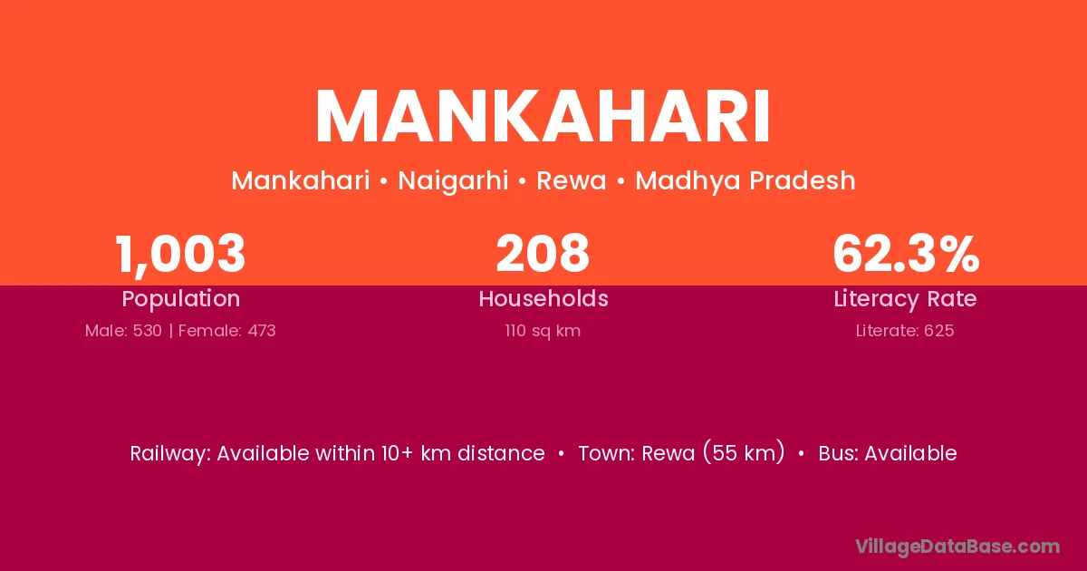 Rewa (55 km) is the nearest town to Mankahari village for major economic activities and is located approximately 55 km away.