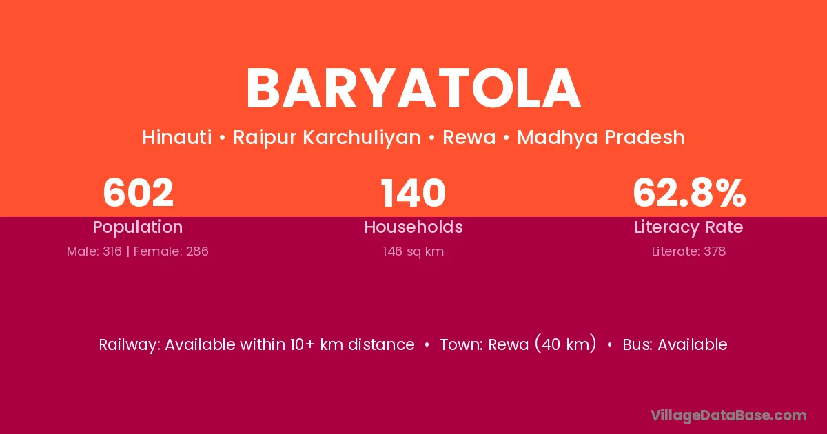 Rewa (40 km) is the nearest town to Baryatola village for major economic activities and is located approximately 40 km away.