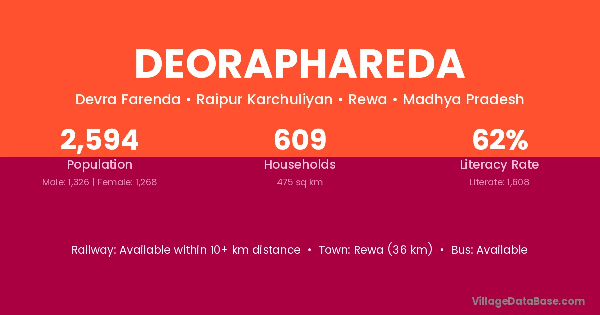 Rewa (36 km) is the nearest town to Deoraphareda village for major economic activities and is located approximately 36 km away.