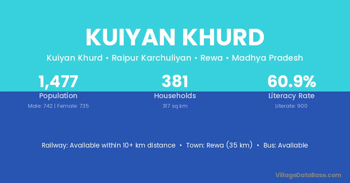 Rewa (35 km) is the nearest town to Kuiyan Khurd village for major economic activities and is located approximately 35 km away.