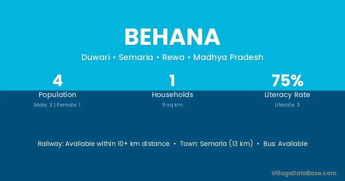 Semaria (13 km) is the nearest town to Behana village for major economic activities and is located approximately 13 km away.