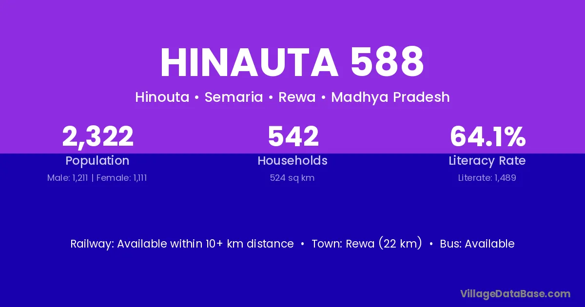 Rewa (22 km) is the nearest town to Hinauta 588 village for major economic activities and is located approximately 22 km away.