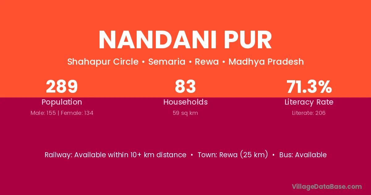 Rewa (25 km) is the nearest town to Nandani Pur village for major economic activities and is located approximately 25 km away.