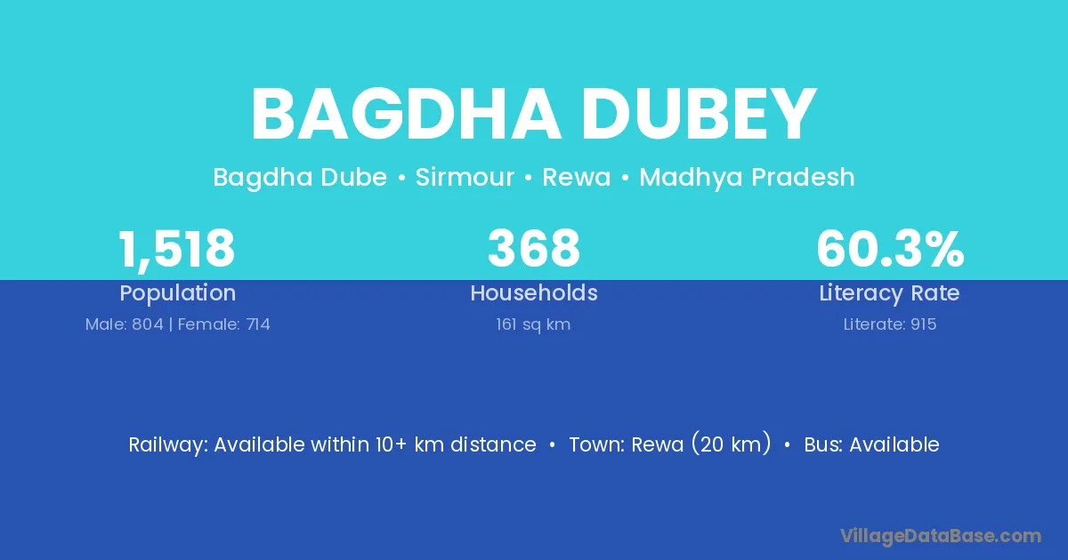 Rewa (20 km) is the nearest town to Bagdha Dubey village for major economic activities and is located approximately 20 km away.