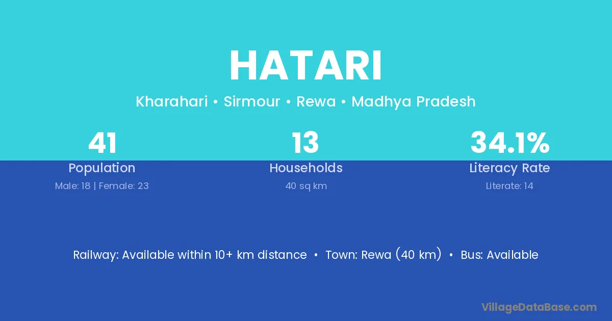 Rewa (40 km) is the nearest town to Hatari village for major economic activities and is located approximately 40 km away.
