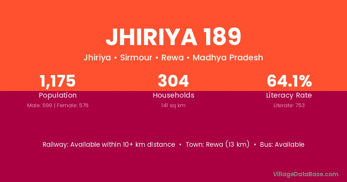 Rewa (13 km) is the nearest town to Jhiriya 189 village for major economic activities and is located approximately 13 km away.