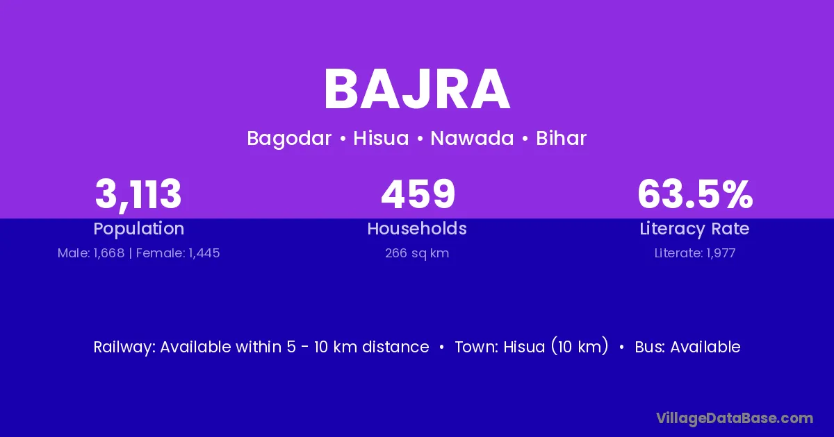The literacy rate of Bajra village is 62.13%. Male literacy stands at 69.57% and female literacy at 54.18%.
